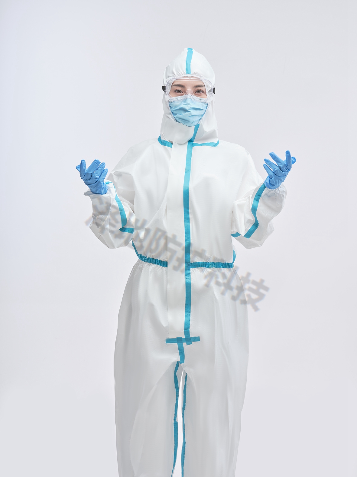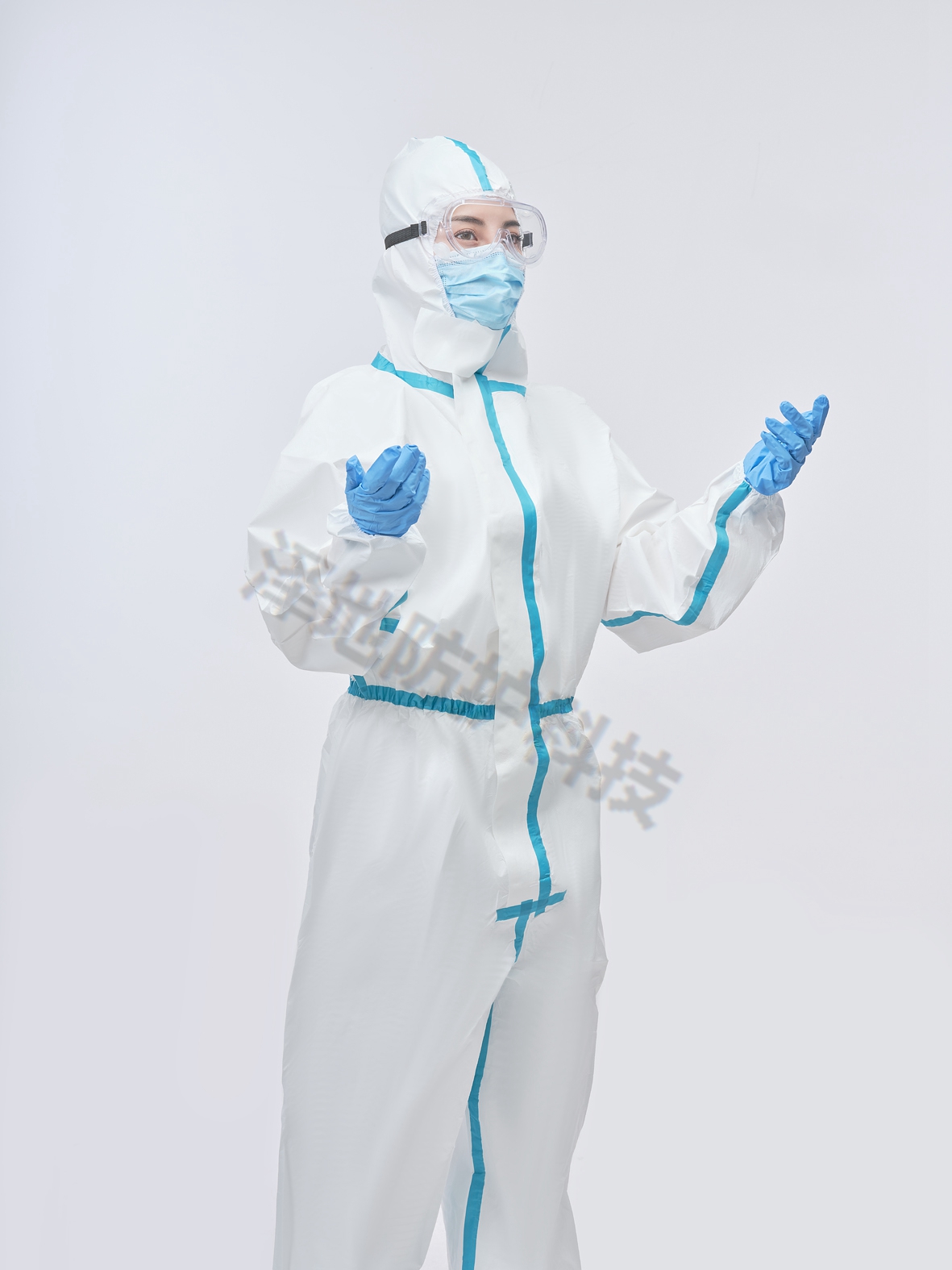 本产品面料为聚丙烯+聚乙烯覆膜,65克每平方米,帽子采用松紧带工艺,贴合面部,增强保护效果,各拼缝处采用缝合胶条密封工艺,更好的提高安全防护性能。腰部采用内部松紧带贴合工艺,更好的增强服装贴合度,前中拉链式设计更方便穿脱,增加挡风板设计能更好的增强防护作用。袖口采用内部松紧带贴合工艺,更好的增强密封性和防护性。收缩脚口采用内部松紧带贴合工艺,更好的增强紧密度。本产品通过EN14126测试,拥有欧盟自我符合性声明和注册信息,以及FDA注册。